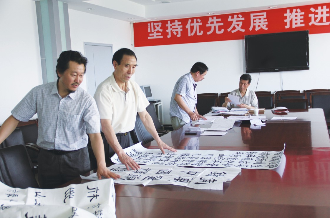 晖、张岗、左玉民、朱兴国在市教育局评选师生参赛书法作品。