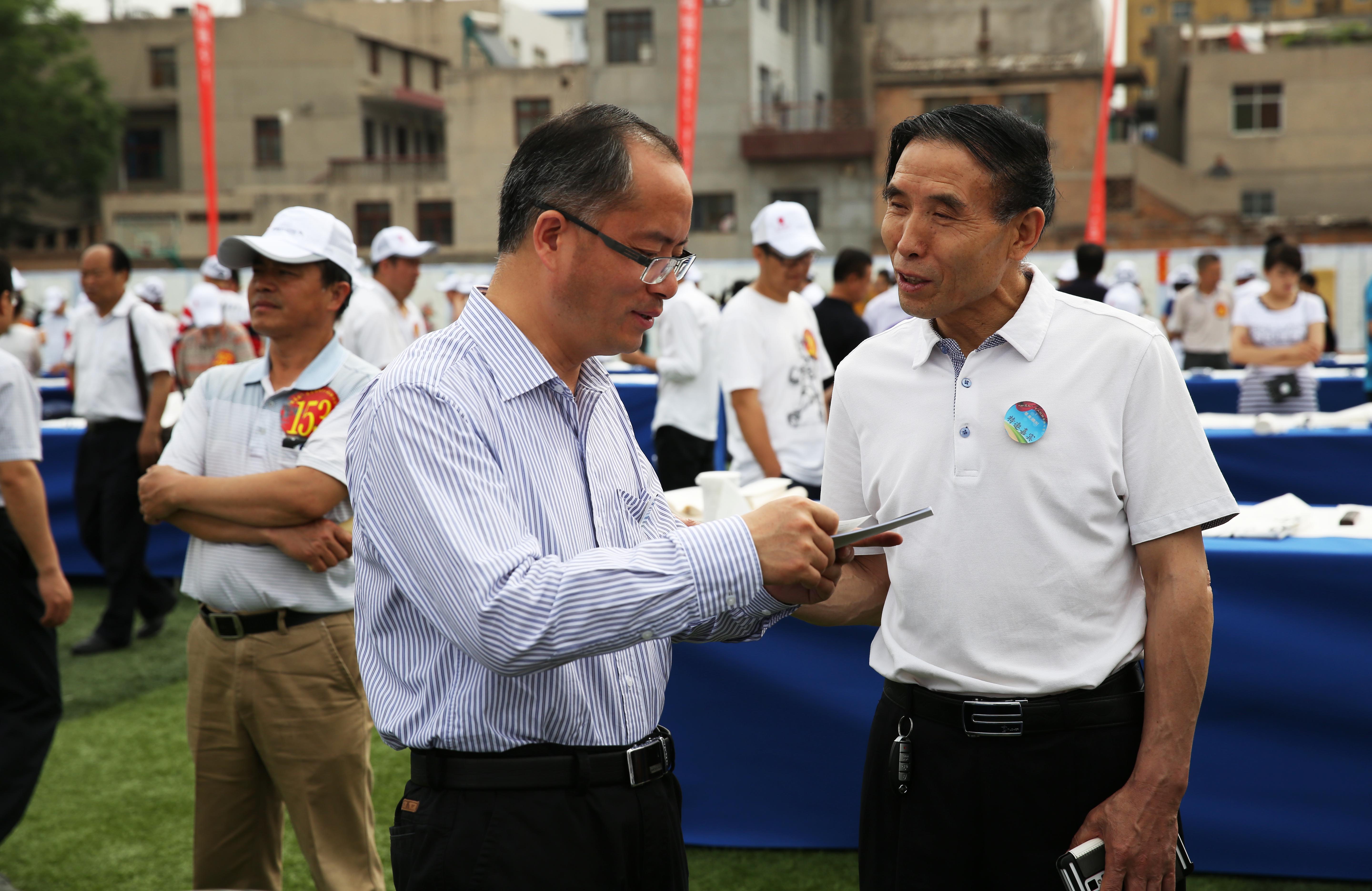 7.陕西柳范书画研究院王朝晖院长与铜川市委常委、副市长刘德阳在铜川市耀州区“柳范杯”千人书画大赛现场进行信息交流。